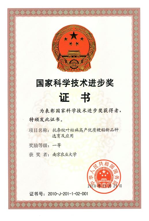 成果名称:抗条纹叶枯病高产优质粳稻新品种选育及应用