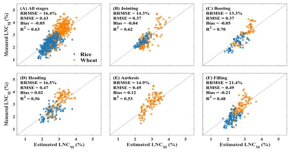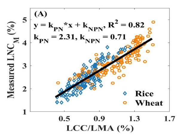 叶片氮含量(Leaf nitrogen content, LNC)是一个重要的作物营养指标,常用于植物光合能力分析和作物营养诊断。目前,高光谱遥感技术已被广泛用于准确、无损地估算作物叶片氮含量。由于叶绿素和氮含量之间有较高的相关性,在过去二十年里,大量研究基于叶绿素在可见光区间的敏感波段,构建各种叶绿素敏感植被指数来估算叶片氮含量。然而,农业领域常用的是全氮含量,叶绿素仅能反映与光合作用相关的光合氮信息,不能完全反映作物叶片中的全氮信息。因此,叶绿素敏感植被指数和叶片全氮含量的关系模型,经常受作物类别、生育期等多个因素的影响,使得这些氮含量估算模型的普适性较差。