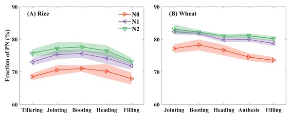 图4. 基于氮分配模型估算的(A)水稻和(B)小麦光合氮比例季节性变化