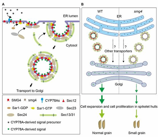 该团队鉴定到一个水稻小粒突变体small grain 4(smg4),该突变体籽粒的粒长、粒宽和粒厚均变小。通过图位克隆和全基因组重测序分析发现SMG4编码一个MATE家族的转运蛋白。进一步对SMG4进行亚细胞定位分析,发现SMG4主要定位于内质网输出位点(ERESs),部分定位于内质网(ER)和高尔基体(Golgi)上。