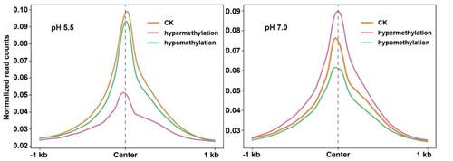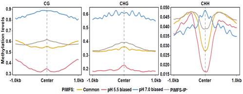 最后,分析结果表明,在pH5.5和7.0条件下,CG-hypo-DMRs和CHH-hyper-DMRs单独或与CG/CHG-hyper-DMRs协同的作用,共同影响iMs的形成。