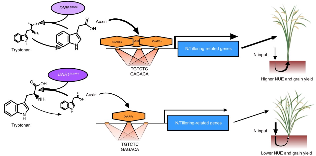 DNR1的启动子序列在籼、粳水稻亚种间存在520 bp的差别,这导致籼稻与粳稻的氮肥吸收速率的显著差异;籼稻中DNR1indica等位基因的低表达导致籼稻中生长素含量升高,使之具有更高的氮肥利用能力。将粳稻品种和DNR1敲除系种植在不同施加氮肥量的大田中,DNR1敲除系均能增产8%-25%,这表明,DNR1在提高粳稻氮肥利用效率上极具应用潜力和价值。