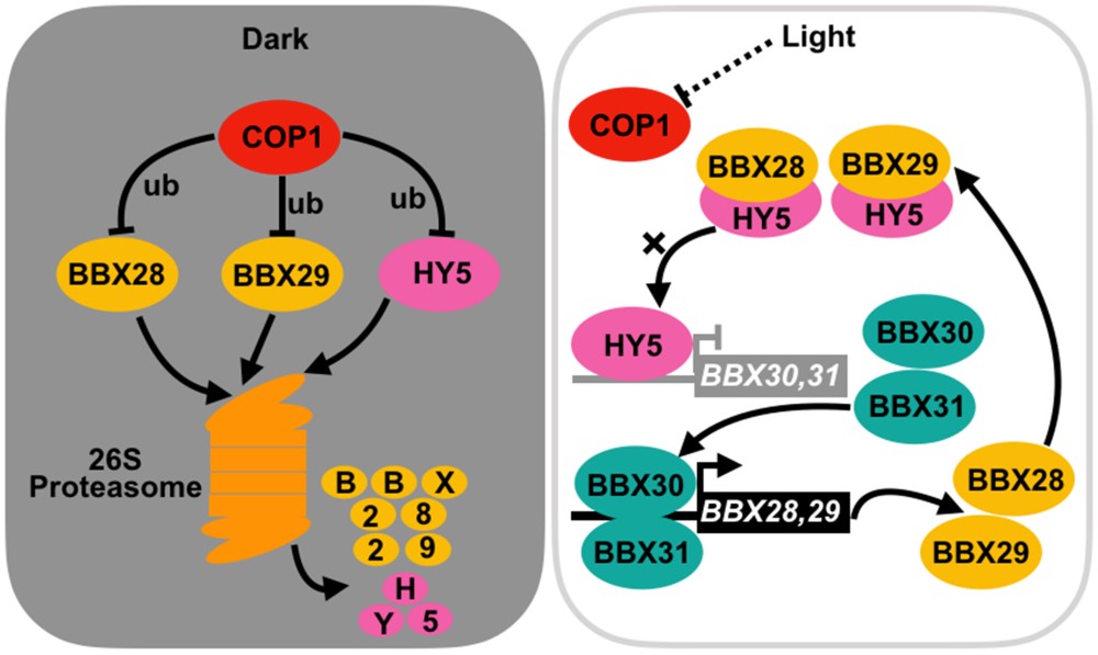 Figure 1. A working model depicting BBX28/BBX29-HY5-BBX30/BBX31 feedback loop in the regulation of photomorphogenesis.
