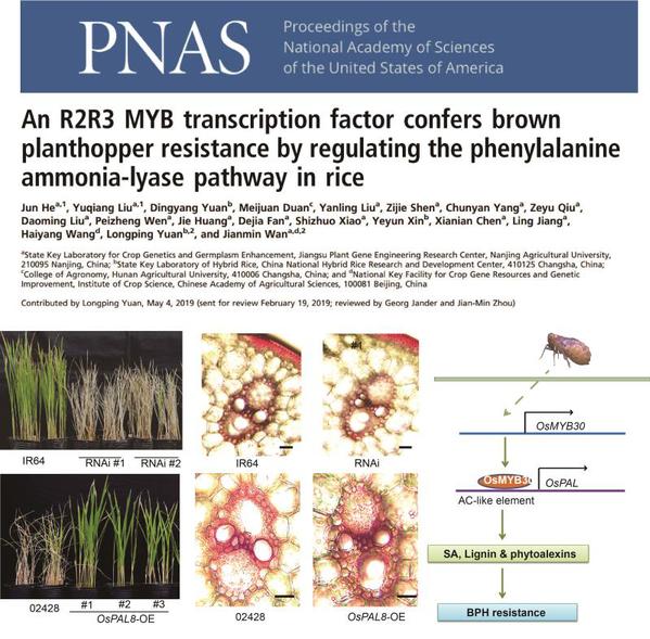 《PNAS》 发表万建民院士团队“An R2R3 MYB transcription factor confers brown planthopper resistance by regulating the phenylalanine ammonia-lyase pathway inrice”