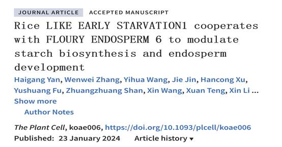 《The plant cell》发表万建民院士团队“Rice LIKE EARLY STARVATION1 cooperates with FLOURY ENDOSPERM6 to modulate starch biosynthesis and endosperm development ”