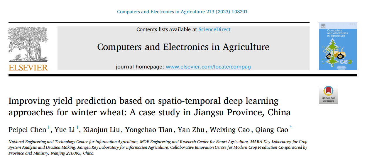 近日,公司种子科学与工程专业192班陈沛沛同学以共同第一作者在农林科学领域TOP期刊《Computers and Electronics in Agriculture》发表了题为“Improving yield prediction based on spatio-temporal deep learning approaches for winter wheat: A case study in Jiangsu Province, China ”的研究论文,该文以江苏省为研究区开展了基于时空深度学习算法的县域尺度冬小麦产量预测研究。