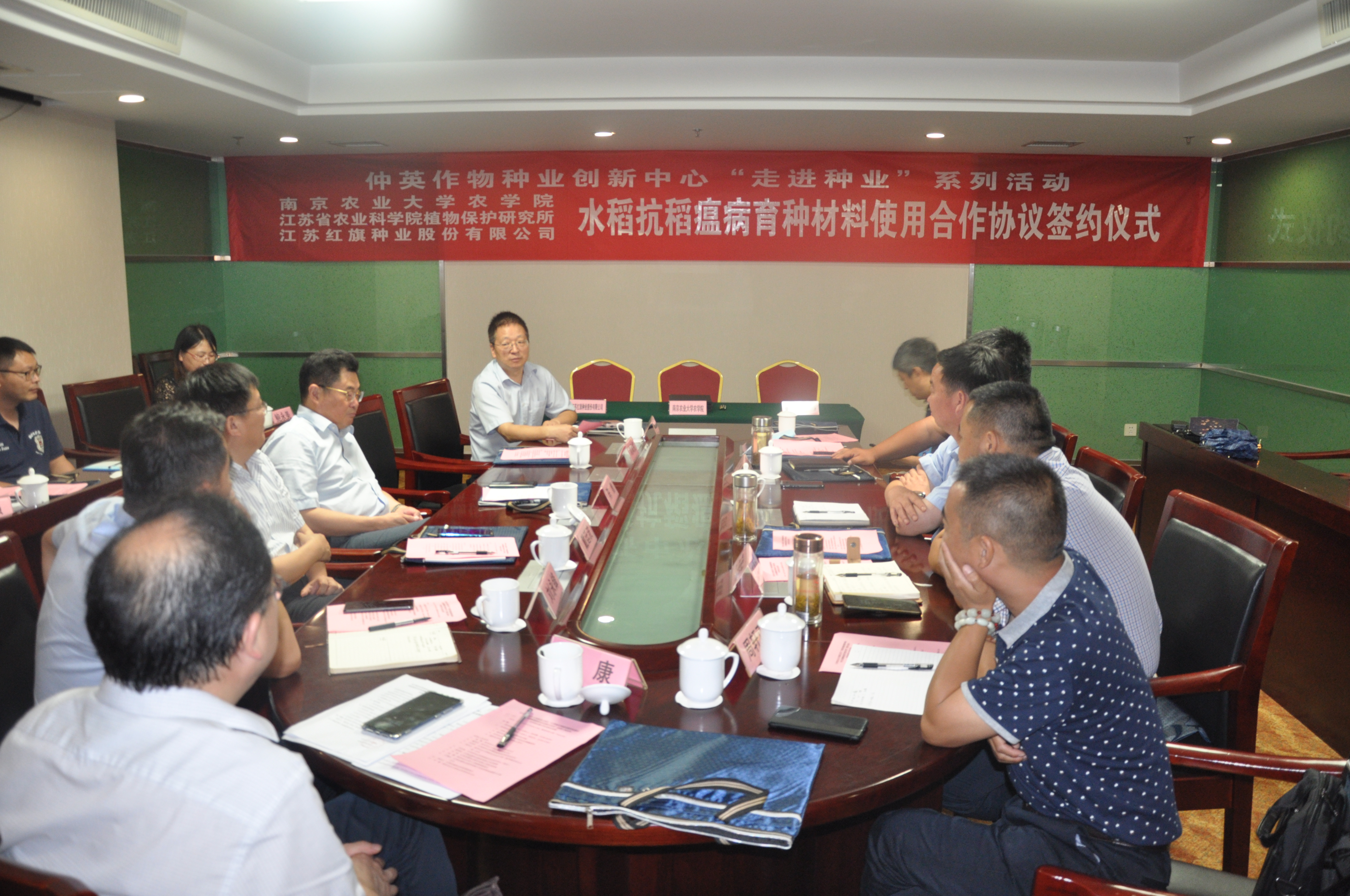7月24日下午,江苏省农业自主创新重点项目“江淮稻区稻瘟病菌群体遗传分析及抗穗颈瘟基因的发掘与利用”进展汇报会和合作协议签订仪式在公司举行。威廉希尔中文网站平台社会合作处处长陈巍,威廉希尔中文网站平台公司党委书记戴廷波,江苏省农业科学院植物保护研究所所长刘凤权,江苏省农业科学院宿迁农科所所长刘永锋,江苏红旗种业股份有限公司总经理查联群、副总经理华荣,william威廉亚洲官方种业科学系系主任刘康,威廉希尔中文网站平台仲英作物种业创新中心主任鲍永美和张红生教授、黄骥教授等参加会议。