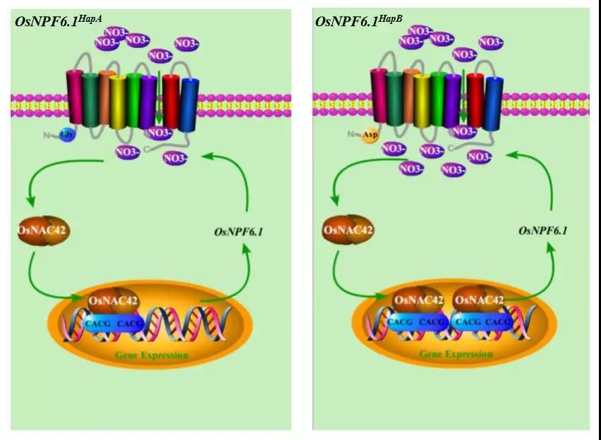 OsNPF6.1HapB编码的蛋白以及启动子元件均发生了变化。进一步研究发现,转录因子OsNAC42可激活OsNPF6.1HapB的表达。此外,OsNPF6.1HapB等位基因源自野生稻的变异,并被选择用于提高氮利用率和产量,但由于氮肥的使用在90.3%的水稻品种中丢失。因此,该研究揭示了NAC42-NPF6.1分子模块在水稻氮利用率中的作用,为水稻氮高效利用和高产育种提供了基因资源和新的策略。