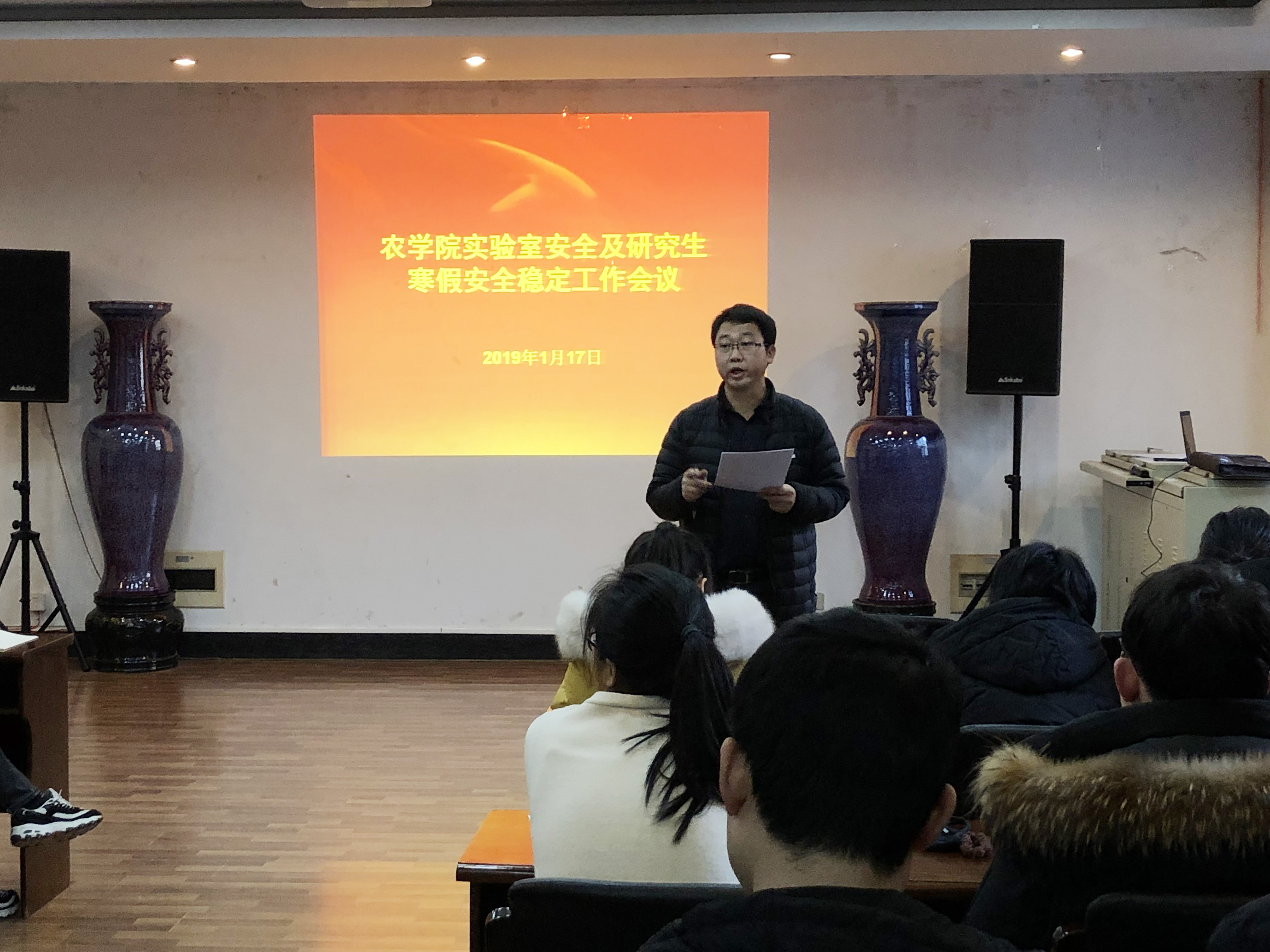 2019年1月17日下午,学院召开实验室安全及研究生寒假安全稳定工作会议,党委副书记殷美,副经理赵晋铭出席会议并讲话。实验室安全老师、研究生辅导员及课题组员工负责人参加会议。会议由辅导员吕美泽主持。