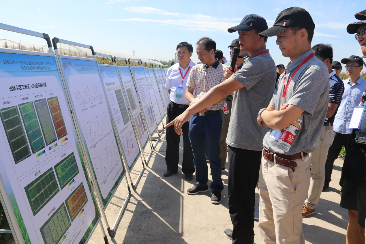 王来刚通过展板为与会人员讲解了相关技术与产品的示范应用情况。课题组在玉米长势星机地遥感监测、氮肥诊断调控等方面取得显著进展,通过多组监测、预测、诊断图,展示了监测诊断技术在新乡县、新乡市、河南省等多空间尺度的良好示范效果。会上还演示了适用于大面积作业的农业低空无人机监测平台,以及项目组自主研发的便携式作物长势监测诊断仪等智能产品。