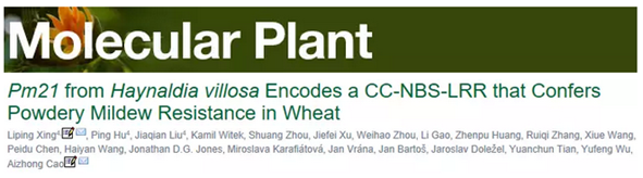 该团队从1998年开始先后在国家自然科学基金重大项目和863重点项目的支持下开展Pm21的克隆研究。但是由于外源染色体在导入小麦遗传背景后与小麦染色体之间不能正常配对和交换重组,Pm21基因在精细定位和克隆过程中遇到了很大的困难。他们又进一步创造了携带抗白粉病的小片段易位系和缺失系,将Pm21基因定位到6V短臂的更小区段。该团队曾克隆了Pm21区域的Stpk-V基因,抗谱研究发现该基因的转基因系对测试的24个白粉菌生理小种中的23个具有抗性,沉默该基因使T6VS·6AL的抗性部分但非完全丧失,猜测Pm21位点还有其他重要基因调控广谱抗性。近年来,该团队与英国The Sainsbury Laboratory和捷克Institute of Experimental Botany的科学家合作,创新外源抗病基因克隆策略,将染色体工程极小片段渐渗系创制、突变体分析(Mutagenesis)、抗病基因富集和第三代测序(RenSeq-PacBio)、易位染色体分拣测序、Chicago long-range linkage assembly、基因沉默、瞬间表达与稳定转化等技术相结合,成功克隆出抗白粉病Pm21位点编码CC-NBS-LRR的NLR1-V基因。该基因的克隆解析了其所在外源染色体区间的序列特征,基因克隆技术还可以为其他外源基因的克隆提供借鉴。该基因的克隆鉴定为小麦抗白粉病研究提供了更坚实的基础。Pm21基因介导的广谱抗性分子机制研究和利用新的基因工程手段培育抗病小麦品种(系)将是后续研究重点。