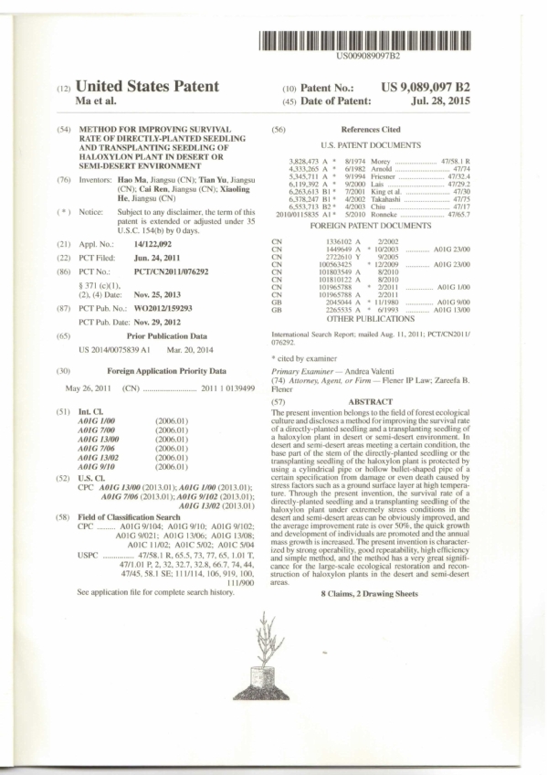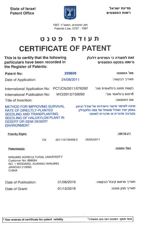 近日,由公司麻浩教授所率科研团队经10多年潜心研究发明的“免灌溉管件防护荒漠造林技术”在获得多项中国国家发明专利和实用新型授权的基础上,又分别获得世界科技最发达国家美国和荒漠化防治领头羊国家以色列发明专利授权,为该荒漠化防治技术利器走上国际市场奠定了基础。