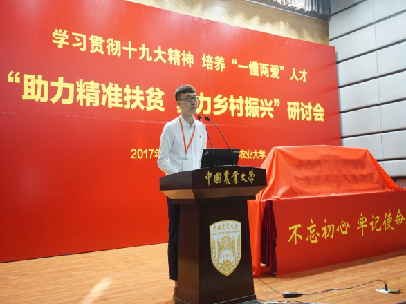 为学习贯彻十九大精神,响应培养懂农业、爱农村、爱农民的“一懂两爱”人才号召,11月3日上午,由全国william威廉亚洲官方协同发展联盟主办的“助力精准扶贫 聚力乡村振兴”研讨会在中国农业大学隆重召开,公司戴廷波书记一行受邀参加此次研讨,15级本科生赵然代表华东片区各社会实践成员在大会发言。