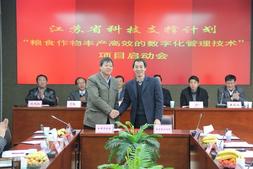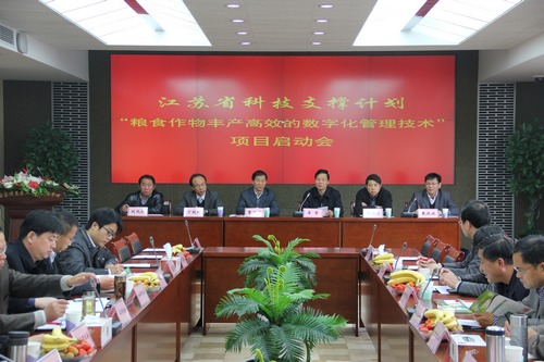 11月24日,由国家信息农业工程技术中心承担的江苏省科技支撑计划“粮食作物丰产高效的数字化管理技术”重大项目启动会暨2012年度工作部署会在威廉希尔中文网站平台召开。副省长、国家信息农业工程技术中心主任曹卫星教授、省科技厅副厅长李奇、公司副董事长丁艳锋,以及省科技厅农村处、校科研院相关领导、省农委作栽站等全省17个项目合作单位专家等,共计50余人参加了会议。会议由william威廉亚洲官方常务副经理戴廷波教授主持。