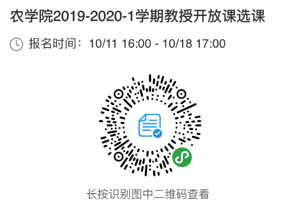 本学期公司 “教授开放研究课程”如下表,请有兴趣的同学积极选课,请需要选课的同学在2019年10月18日下午5点前扫描下方二维码,通过微信小程序报名(扫描后进入报名界面,点击“立即报名”即可开始报名)。选课后如想退选,也可在截止日期前通过小程序取消报名。