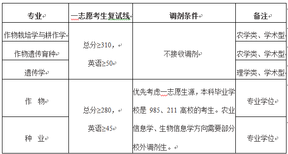 1.第一志愿报考公司作物栽培学与耕作学、作物遗传育种、遗传学3个专业的考生总分在310分以上,英语50分以上(含310分,50分),可以参加所报考专业复试;报考作物和种业2个专业的考生复试分数线总分在280分以上,英语45分以上(含280分,45分),可参加复试,不足部分调剂。