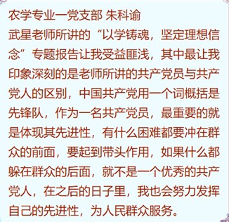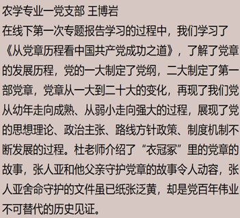 老师强调到:“理论学习是提升党性修养的法宝。各位党员同志应当坚持立场观点方法,做马克思主义的忠实实践者;作为农业大学的员工,应当在推进农业农村现代化的进程中贡献青春力量;始终牢记自己的身份角色,增强党员意识,勇于实践,争当表率。”