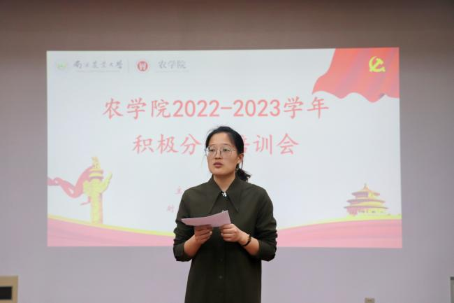 孙小雯老师作总结发言,她表示吴教授的培训不仅有广度更兼具深度,让人获益匪浅。希望同学们能够继续深入学习贯彻党的二十大精神,学好专业知识,不负强农兴农的使命担当,为实现农业现代化而努力奋斗!