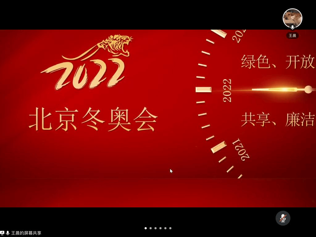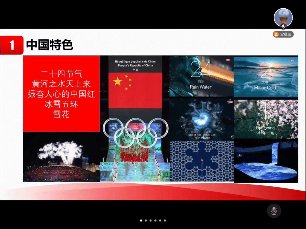 首先乔子金同学从申奥背景出发,介绍中国为什么能举办冬奥会,之后依次介绍北京冬奥会开幕式和冰雪运动项目,为大家诉说中国弘扬的奥运精神。二十四节气倒计时、奥运五环破冰而出、56个民族传递国旗等又无一不向世界呈现中国人的浪漫与文化内涵。