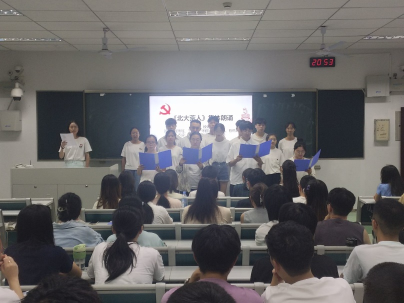 最后,第一大组全体成员带来集体朗诵《北大荒人》,同学们声音洪亮,热情饱满,赢得了支部成员们的掌声。