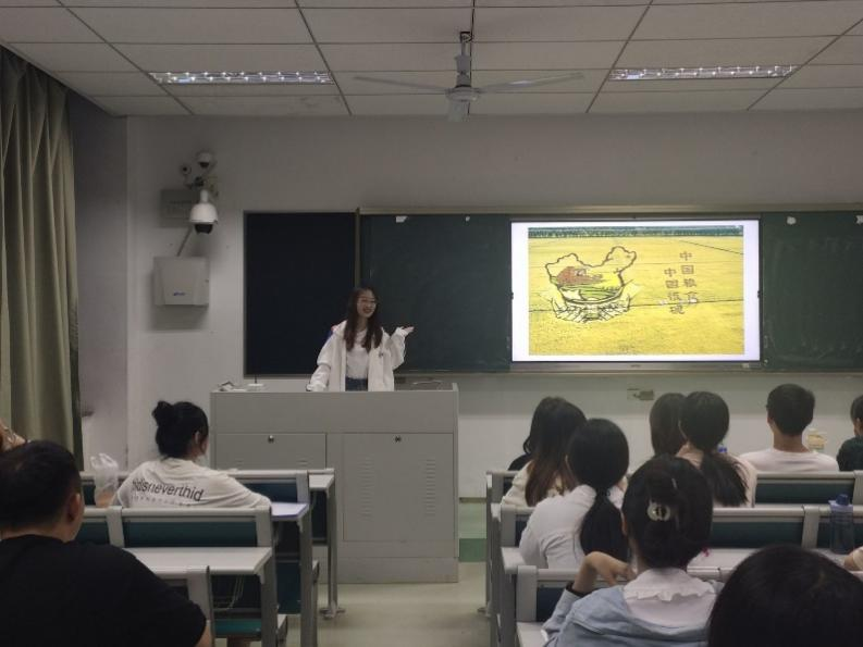 分班讨论主要分为三个部分。首先是由来自农学192班的孙祎诺同学对北大荒精神的起源进行了剖析。她采取提问的方式,带大家认识北大荒的地理位置和自然环境,随后介绍了北大荒建设的时代背景和建设过程,并利用视频展示了北大荒人建设北大仓的艰辛历程,引发同学们的思考。