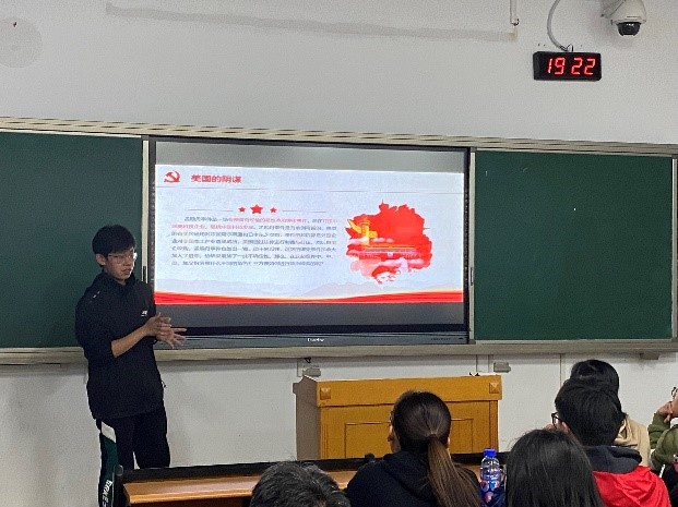 紧接着,由王家成同学从美国的阴谋论切入,深入剖析整个事件的来龙去脉,从表面的指控到深层的政治对抗,揭开了事件的虚伪面具暴露出其下丑陋的阴谋和邪恶的政治关系,通过解释“双重犯罪”、“长臂管辖”等名词的定义,让同学们对整个事件有了一个更加深入的了解。