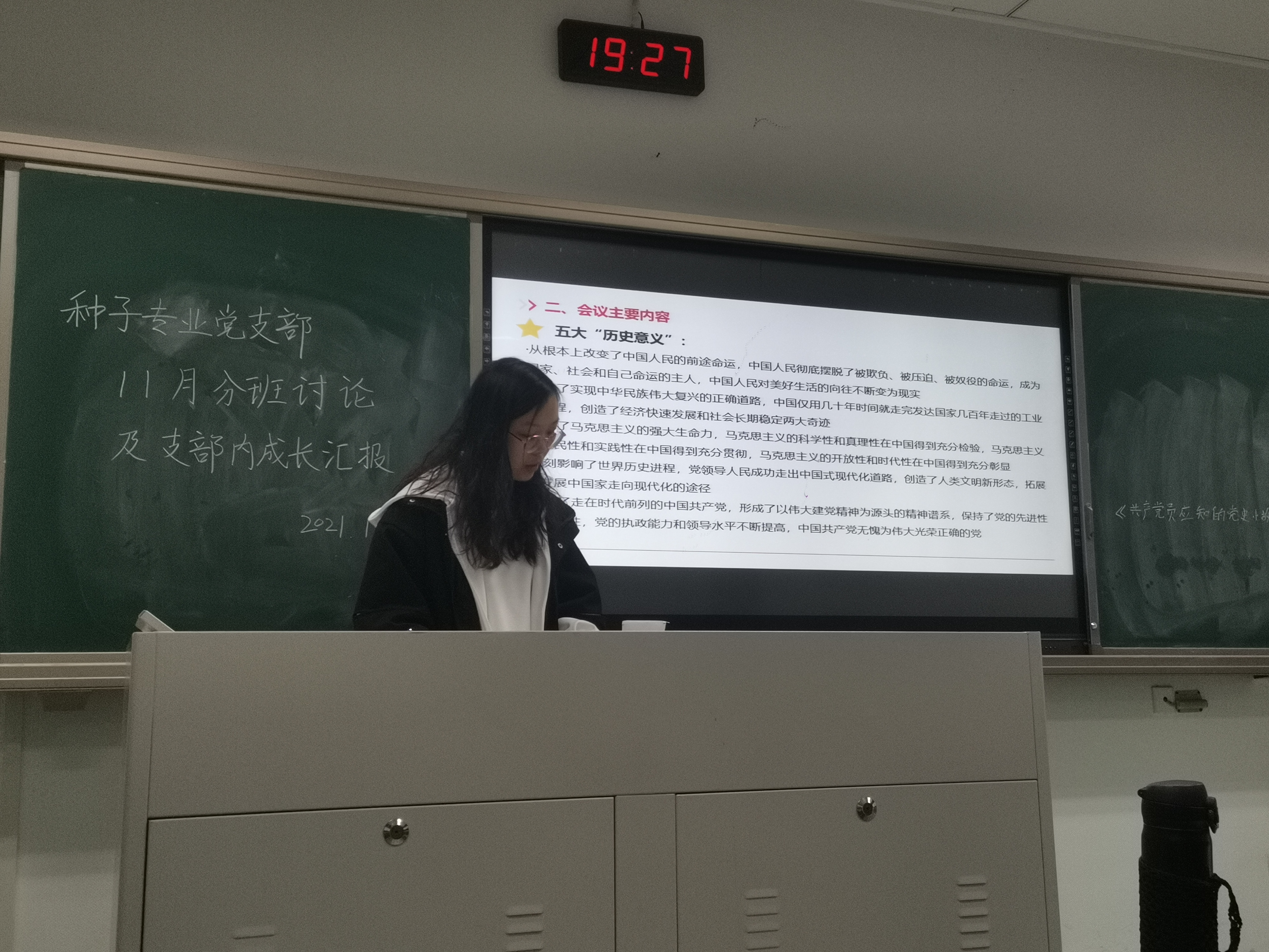2021年11月24日,种子专业党支部在主楼310开展主题为“庆祝中国共产党成立100周年”的分班讨论。本次会议由积极分子魏子曼主持,种子专业党支部党员、预备党员以及积极分子参加了分班讨论。