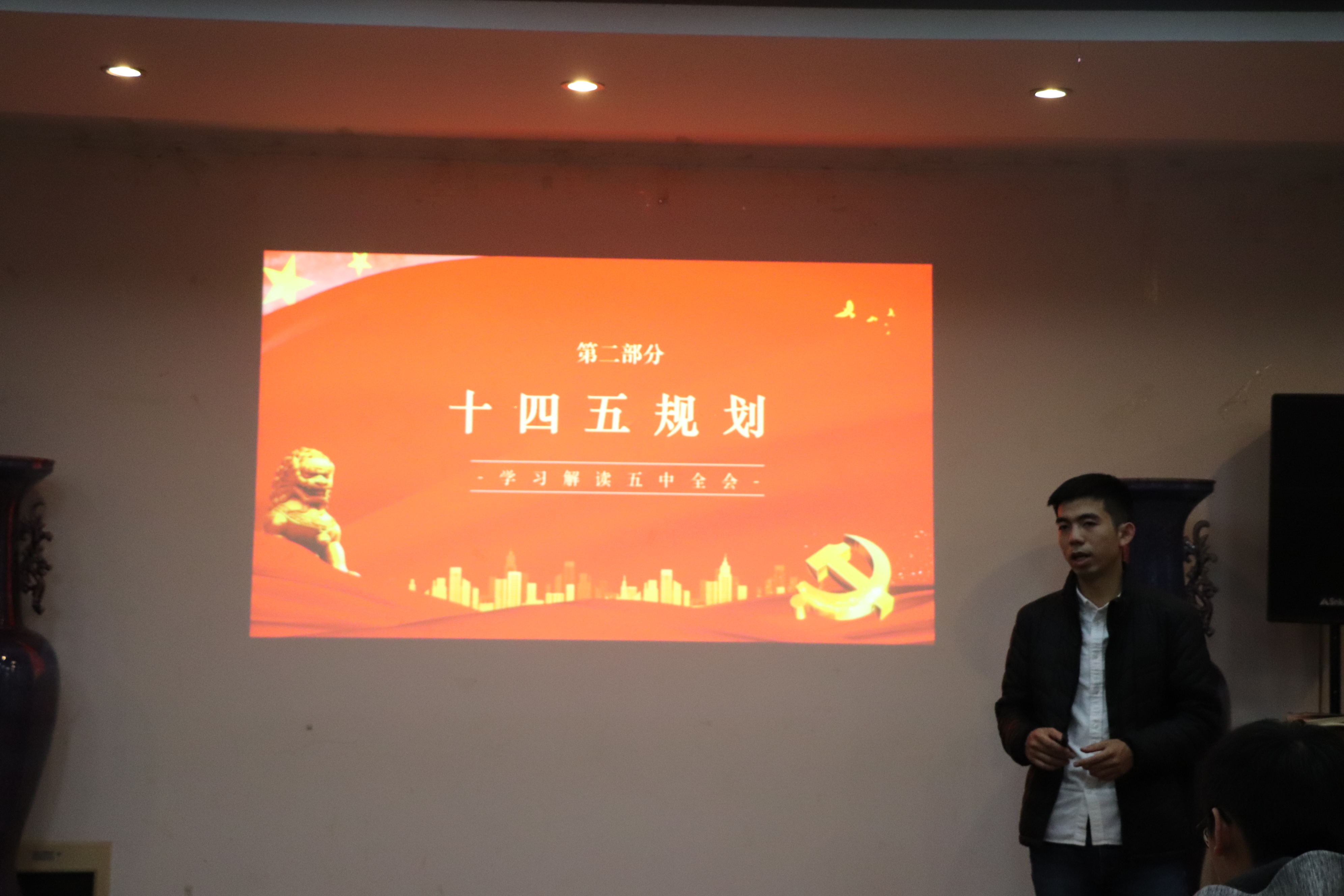 冯建铭老师从十九届五中全会议程开始,带领同学们重点学习了会议中做出的一个重要判断,即有习近平同志作为党中央的核心、全党的核心领航掌舵,有全党全国各族人民团结一心、顽强奋斗,我们就一定能够战胜前进道路上出现的各种艰难险阻,一定能够在新时代把中国特色社会主义更加有力地推向前进。接着,冯老师同所有的员工骨干一起回顾了决胜全面建成小康社会取得的10方面决定性成就,以及会议中指出的我国发展环境面临的机遇和挑战,在全球面临疫情大考的背景下,习近平总书记提出的人类命运共同体愈发显现出它的前瞻性和重要性。随后,冯老师和大家分享了十四五规划和二〇三五远景目标规划,从“二〇三五要实现的9方面远景目标”,到“十四五时期经济社会发展的6方面主要目标”,最后着重强调了“实现奋斗目标的12方面举措和9个坚持”。
