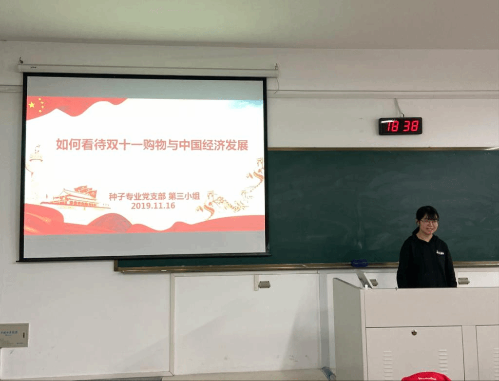 2019年11月16日晚上六点半,种子专业党支部在教四楼B204召开了以“如何看待双十一购物与中国经济发展”为主题的分班讨论。本次分班讨论由种子专业党支部第三小组负责,党支部书记马艳琴主持。