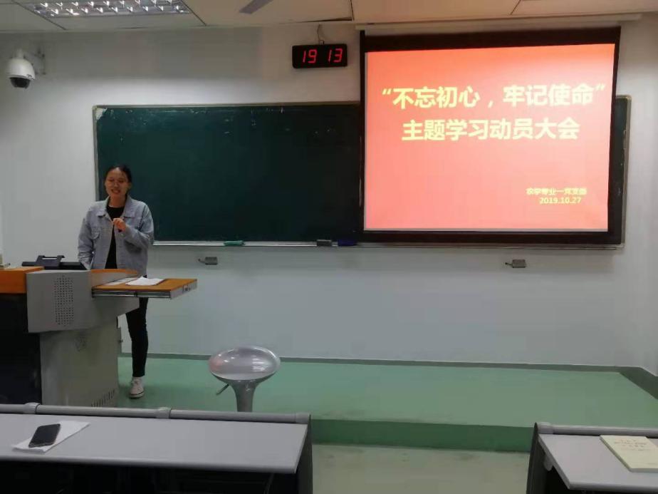 习近平总书记在党的十九大报告中指出,要在全党开展“不忘初心、牢记使命”主题教育,用党的创新理论武装头脑,推动全党更加自觉地为实现新时代党的历史使命不懈奋斗。为积极响应号召,帮助广老员工党员深入学习贯彻习近平新时代中国特色社会主义思想和党的十九大精神,2019年10月27日,农学专业一党支部在主楼组织召开“不忘初心、牢记使命”主题学习动员大会,支部书记王潘婷主持本次动员大会,支部全体党员、积极分子参加会议。