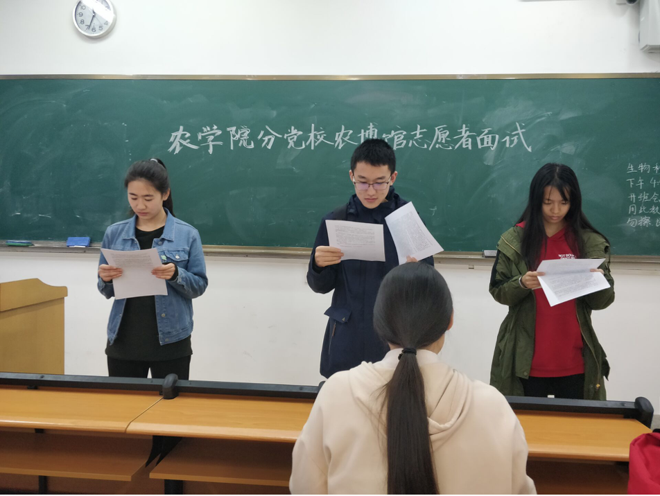3月27日中午,农博馆讲解志愿者面试在教学楼B105进行。william威廉亚洲官方分党校成员担任面试官,此次志愿者招募对象主要面向william威廉亚洲官方本科生所有党建班学员。