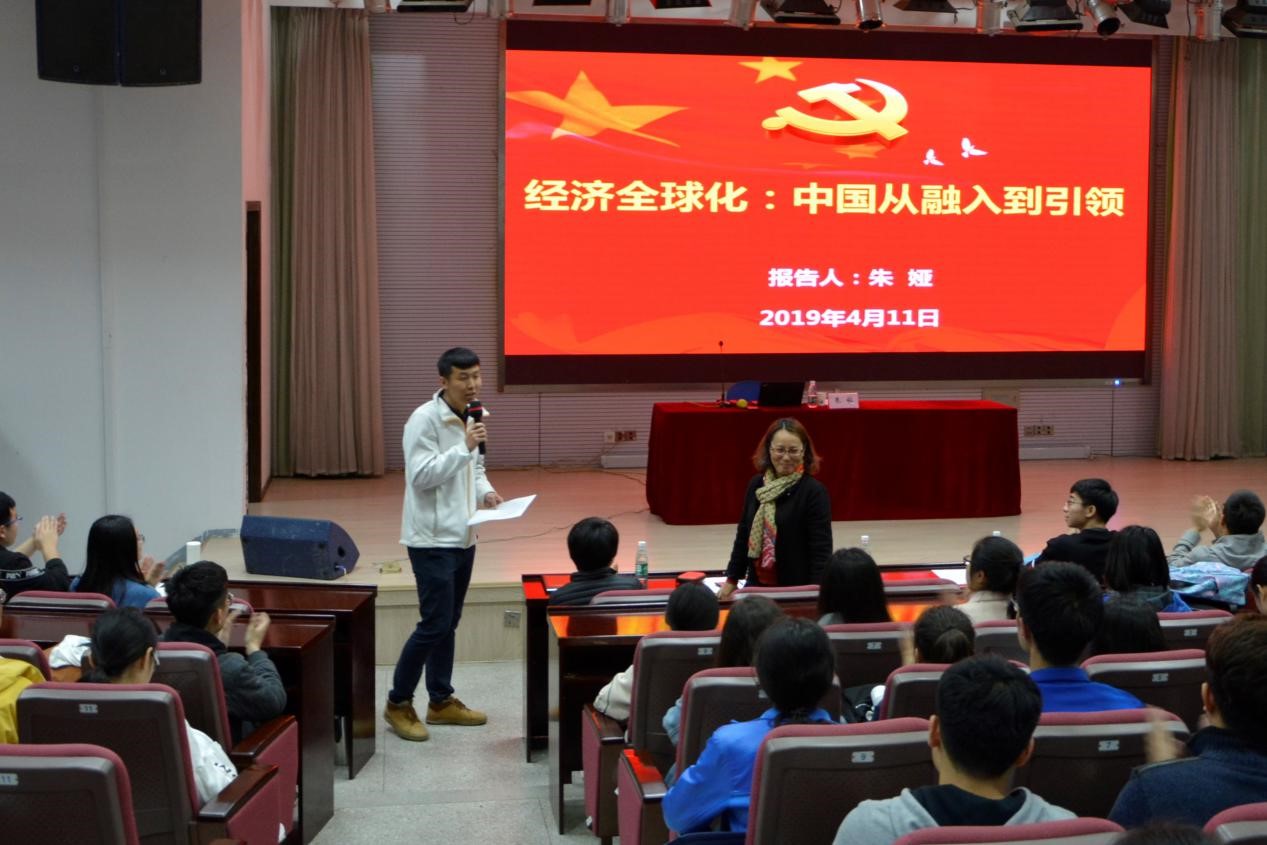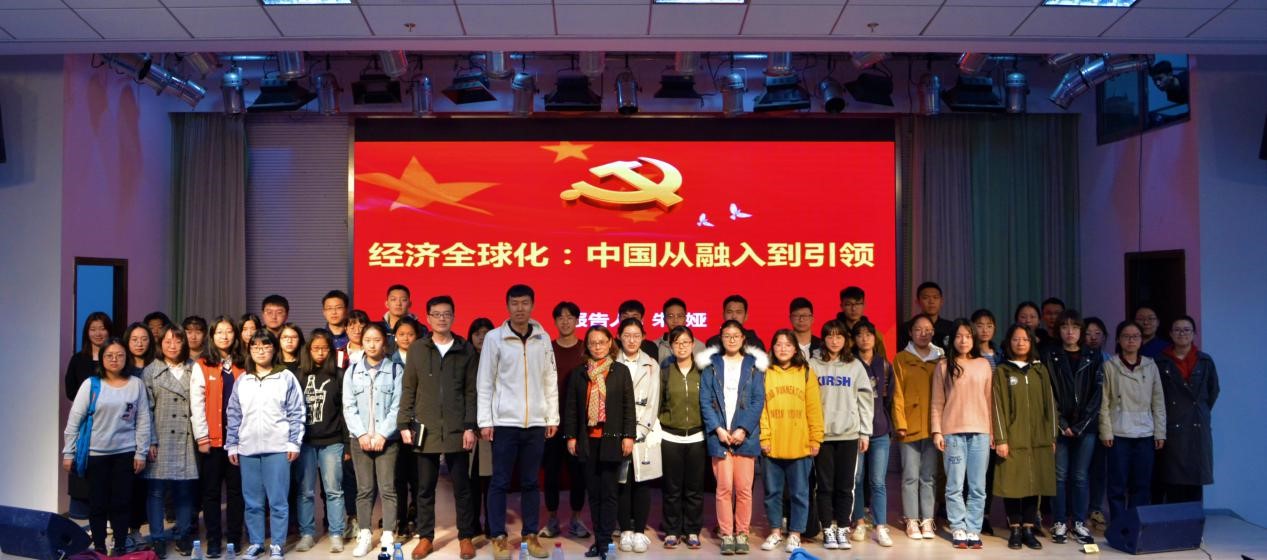 4月11日下午,william威廉亚洲官方分党校在教四楼报告厅开展主题理论党课。本次党课邀请了马克思主义学院马克思主义原理教研室主任朱娅老师作题为“经济全球化:中国从融入到引领”主题党课。公司党委副书记殷美、本科生辅导员王彬、马丽娟、研究生辅导员吕美泽出席了本次党课,william威廉亚洲官方2018年12月份新发展党员、部分积极分子及启蒙班全体学员参加了党课学习。本科生辅导员王彬主持了此次党课。