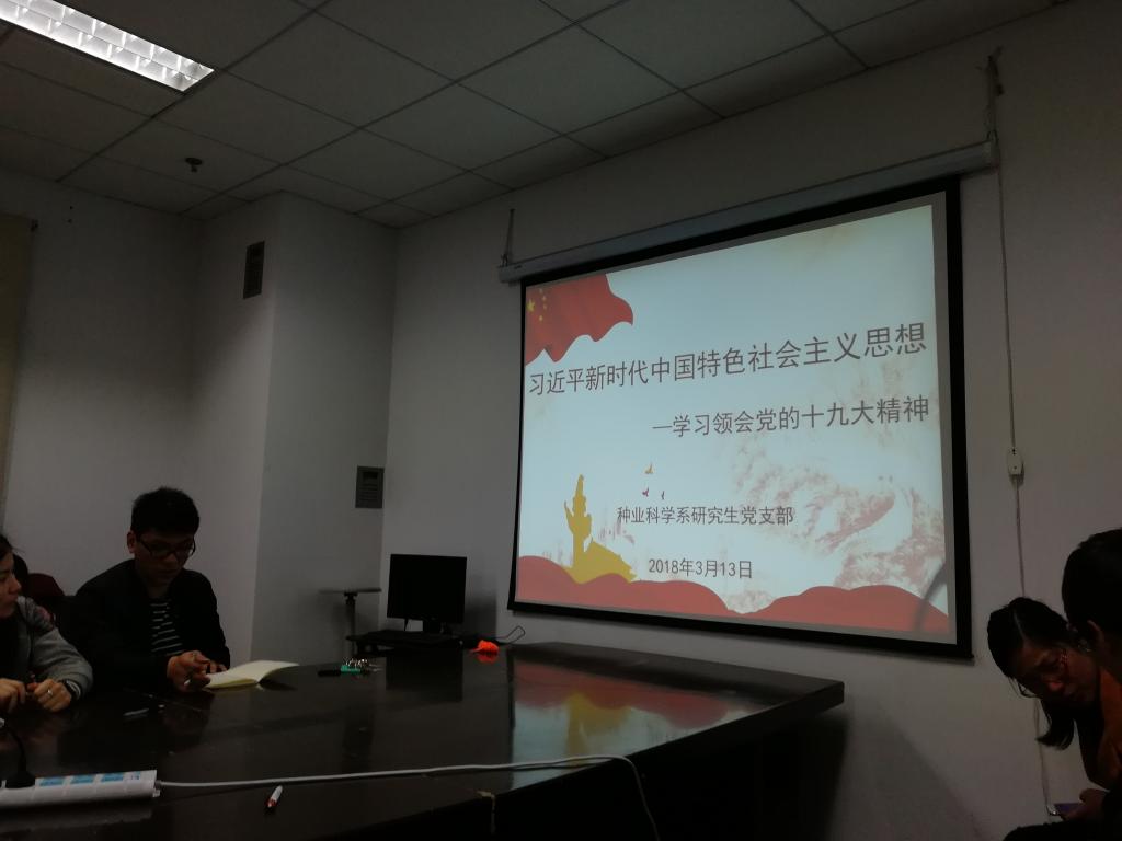 3月13日晚七点,种业科学系研究生党支部在理科楼D701召开组织生活会,主题是学习习近平新时代中国特色社会主义思想,支部副书记郭凌凯为大家播放了中央党校谢春涛同志关于我们如何理解新时代的视频。视频最后,六个来自社会不同层面的青年代表向谢教授各自提问了问题,有关于员工党员如何在日常生活中保持自我的先进性,有如何将自己的个人梦与中国梦结合起来的等等,这几个问题都与我们密切相关,引起了我们的强烈共鸣,通过谢教授的解答,我们受益匪浅。学习结束之际支委会收集了同志们的党支部班子民主评议表,并简要安排了下一步民主评议工作。