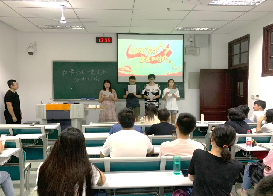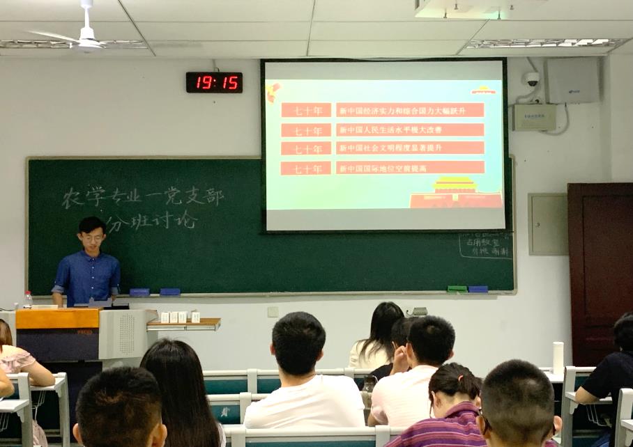 2019年9月28日晚,农学专业一党支部在主楼303进行了分班讨论。讨论围绕“壮丽70年,奋进新时代——庆祝新中国成立70周年”主题展开。本支部所有党员、预备党员和积极分子参与讨论,一党支部书记王潘婷同志主持此次讨论会。