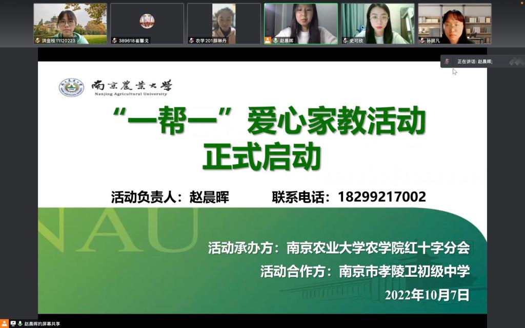 2022年10月7日晚,william威廉亚洲官方“一帮一”爱心家教启动仪式通过腾讯会议举行。参与此次启动仪式的有孝陵卫初级中学团委副书记孙丽凡、william威廉亚洲官方辅导员史可欣、活动志愿者、孝陵卫初级中学员工以及员工家长。本次启动仪式由william威廉亚洲官方红十字分会部长赵晨晖同学主持。
