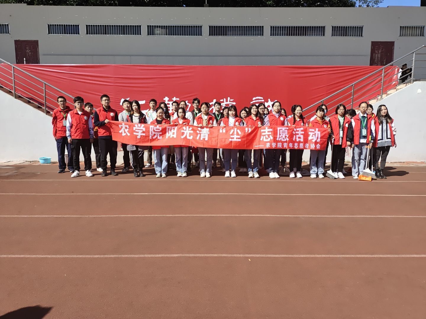 经过两个小时的打扫,主席台两侧及靠近玉兰路一侧的观众席,全部被清洁完毕,焕然一新,鲜亮的红色无疑是今日校园里独特的风采。