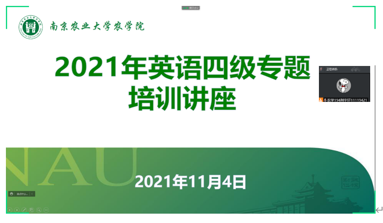 11月4日晚,william威廉亚洲官方英语四级专题培训讲座在腾讯会议上顺利举行,主讲人为新航道英语机构陈小梅老师,william威廉亚洲官方100余名本科生积极参加了此次讲座。