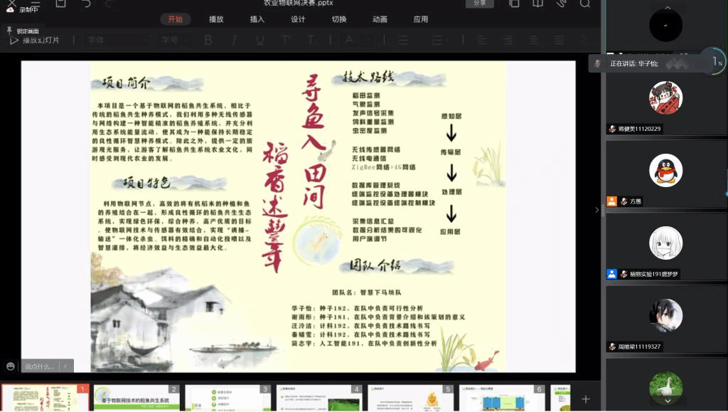 接着杨凯文同学从如何选题、如何规划总则、怎样进行现状分析和创新分析等方面进行了详细的讲解,并建议参赛选手项目要有可行性,不拘泥于全面,要突出重点内容。华子怡从初赛和决赛两个方向进行了细致的分析,重点突出了关键技术,可行性分析,创新技术三部分内容的重要性。王庆凯同学重点讲解了比赛的整体思路,提出要从行业痛点出发,提出合理的解决方案。三位分享人的视角各不相同,互相补充,得到了大家的肯定。