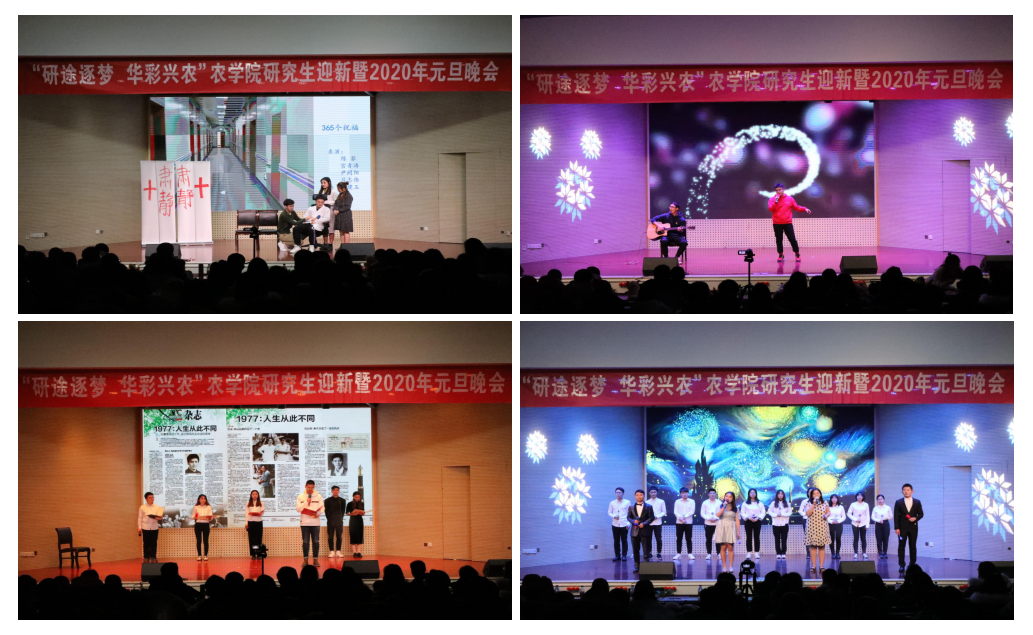 活动开始前播放了新年祝福视频,随后热情洋溢的开场舞拉开了本次晚会的帷幕。晚会分为三个篇章,第一篇章:凝聚·希望。今年是祖国母亲的70华诞,开篇以突出爱国情怀为主旋律《歌唱祖国》激发师生内心的自豪感和自信心,展示了农学人对祖国的崇敬与希冀。小品《365个祝福》表达了对新的一年美好祝愿。第二篇章:逐梦·青春,突出青春向上的靓丽色彩。一首《不 cold 该 play》打动了场下的许多观众。作为当代研究生,我们肩负着历史使命和时代责任,朗诵《少年中国说》慷慨激昂,感人肺腑。属于william威廉亚洲官方的《青春disco》燃爆现场,贴合了学科特色,又与时尚元素结合,赢得了同学们的掌声。第三篇章:仰望·星空,整个篇章以中国传统文化为特色,继往开来。歌曲串烧《新的心声》,带着对未来的憧憬与收获的期盼站在春天的门槛,同一片星空下《仰望星空》,以最真实的渴求,一同追寻属于农学人的星空梦想。最后,晚会在歌曲《相亲相爱》中圆满结束。