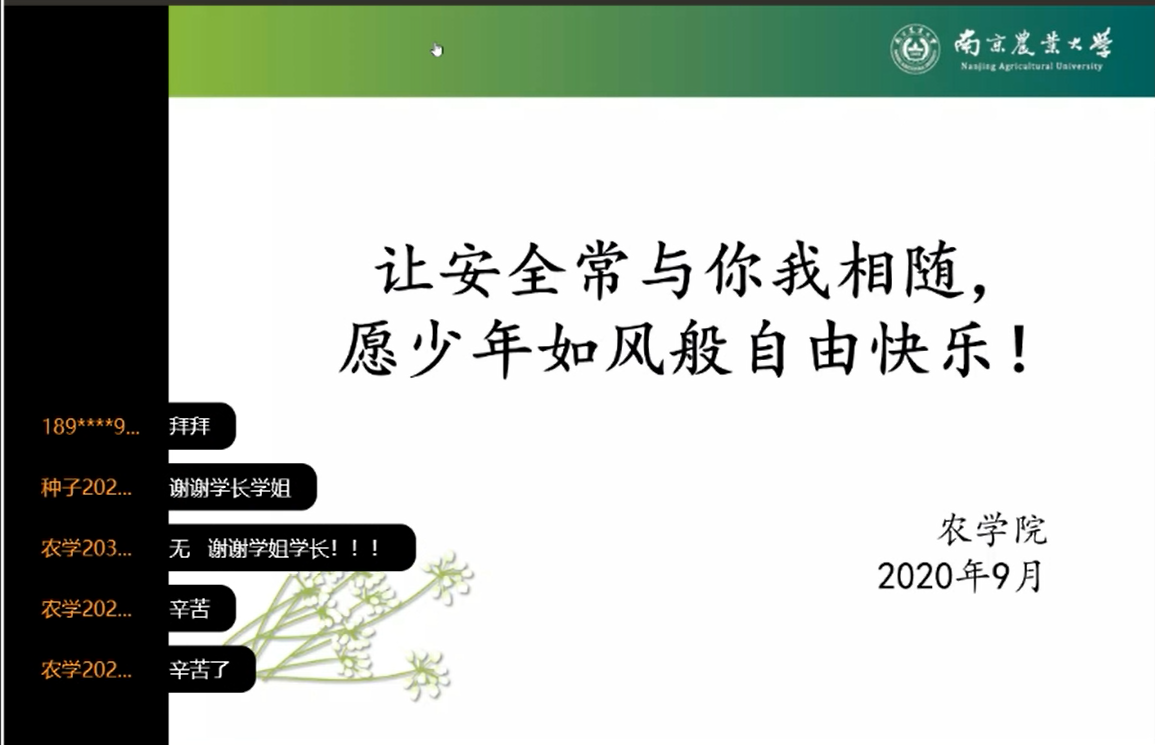 9月17日上午,william威廉亚洲官方2020级新生因军训遇雨,在宿舍通过线上视频会议的方式上了一堂妙趣横生的安全教育课。课程由农学203班团务助理李焕东主讲,william威廉亚洲官方员工团委副书记钟君如主持。