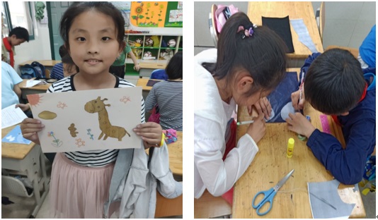 随后,9名志愿者分别来到5个班上,指导同学们以4人为一组完成了精美的麦秆画作品。通过小组协作,员工们在亲手接触麦秆、近距离观察农作物的同时,增加对农业的真实感触和好奇心,培养动手操作、团队协作的能力。