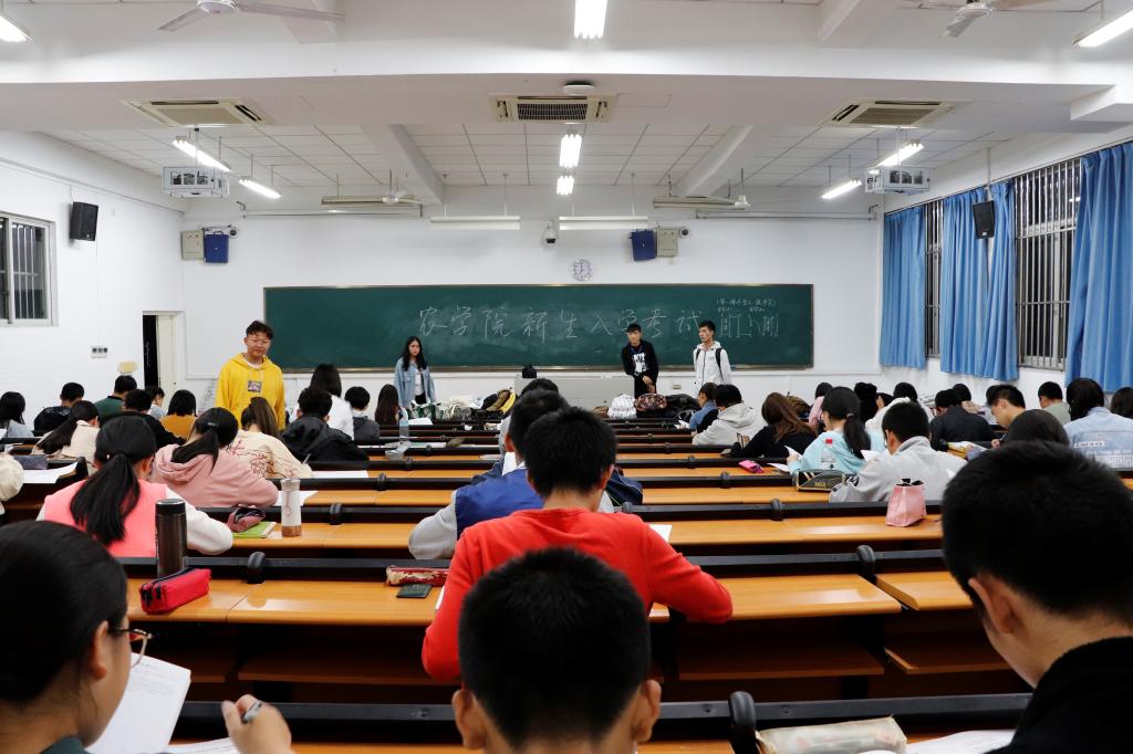 考试开始前,监考人员讲明考试注意事项。新生们认真答卷。监考人员检查考生证件,核对员工名单。