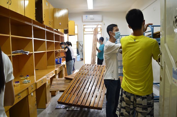 下午2点,各小组的负责人带领大二同学从各自的宿舍拿来笤帚、抹布等工具,准时到达各自负责的十三舍和二十舍,开始进行卫生大扫除。天气比较炎热,但大家丝毫不懈怠。他们对柜子、抽屉里的杂物进行了清理,桌椅、门窗、地面也打扫的干净整洁。