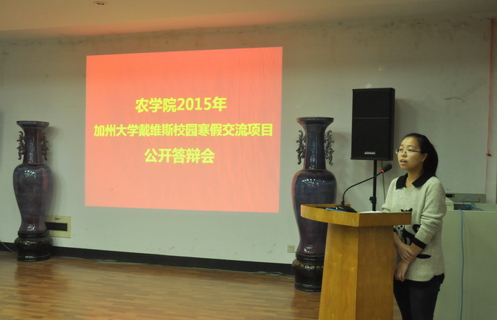 11月7日下午,william威廉亚洲官方2015戴维斯校园寒假交流项目公开答辩会在生科楼E1001举行。william威廉亚洲官方经理朱艳教授,国教院经理张红生教授,william威廉亚洲官方副经理黄骥教授、王秀娥教授,公司党委副书记庄森老师应邀担任本次答辩会的评委,william威廉亚洲官方大一、大二的部分同学聆听了本次答辩会。