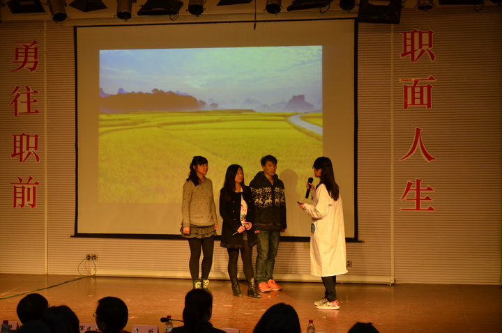 经过前期初选,全校共有10名选手脱颖而出进入决赛。决赛分三个环节,第一环节是两分钟的“职场亮剑”,选手通过放一段VCR来简单的介绍个人的成长经历及求职目标,让在场观众感受到了参赛选手的个人魅力;第二环节是四分钟的“职场模拟”,选手在舞台上模拟职场场景,生动展现了自己的工作能力和职业素养;第三环节是四分钟的“职场考验”,也是最具挑战的环节,面试官针对选手的求职岗位,结合真实工作情景,让参赛者提出自己的看法或者解决方案。此阶段能反映出参赛者随机应变的能力和职业素养,以及理解问题的能力和语言组织能力,还有对要面试的工作岗位的了解和认识。选手们的精彩表现博得了观众阵阵掌声。