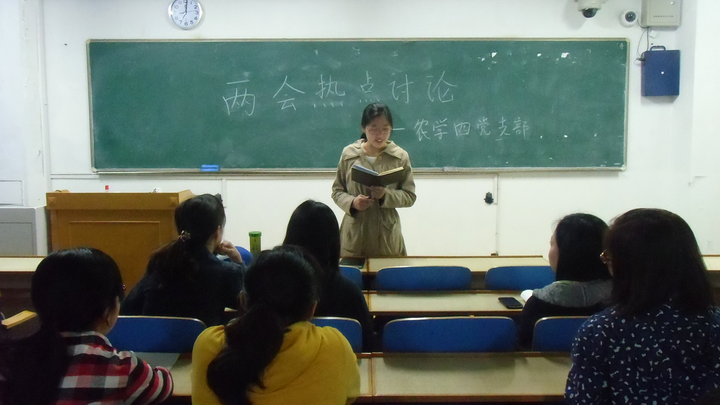 3月30日晚7点,农学专业四支部在教学楼召开了以“两会精神”为主题的分班讨论会议,会议由支部书记王汝琴主持。在会议过程中,支部成员积极主动地发言,畅谈自己对两会精神的见解,并就两会中提出的一些热点问题,如“反腐”、“雾霾”等等,进行了激烈地讨论。