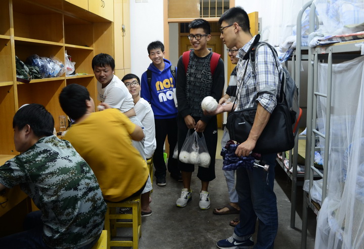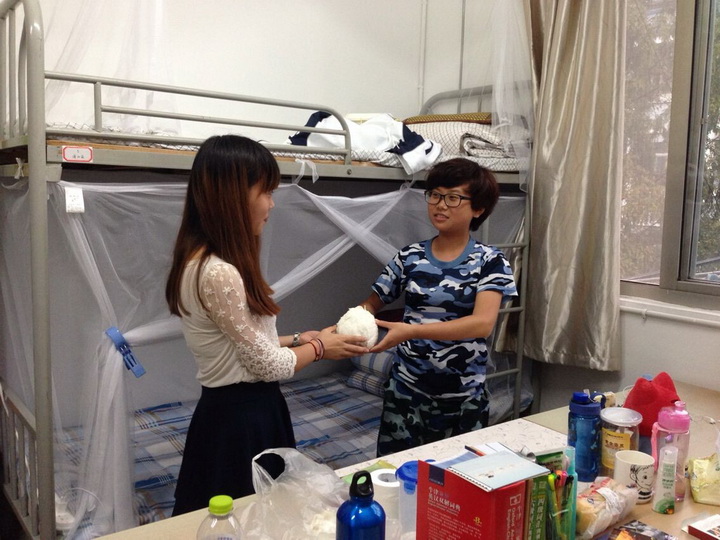 宿舍里,同学们正在休息,看到员工会干部送来了慰问品,纷纷表达了感谢。利用这次机会,学长学姐也和学弟学妹们交流了军训中的酸甜苦辣,并勉励大家刻苦训练,发扬吃苦耐劳的精神,军训也是一次难得的锻炼机会,希望他们好好珍惜。同学们也微笑着表示:一定会圆满完成军事训练任务。