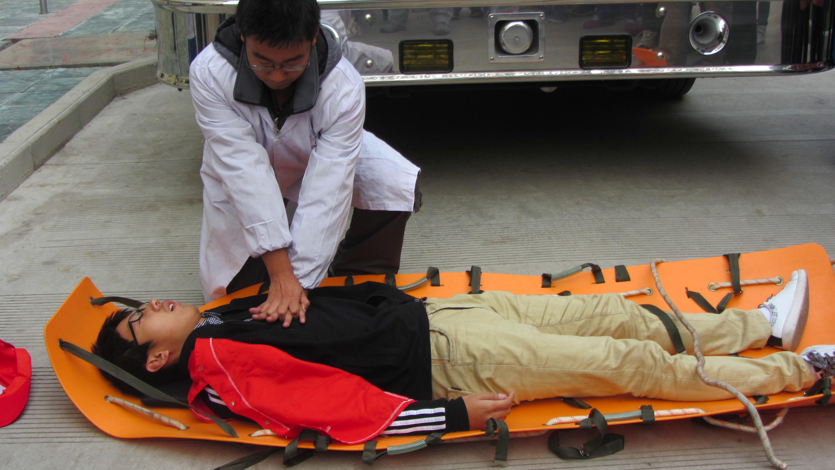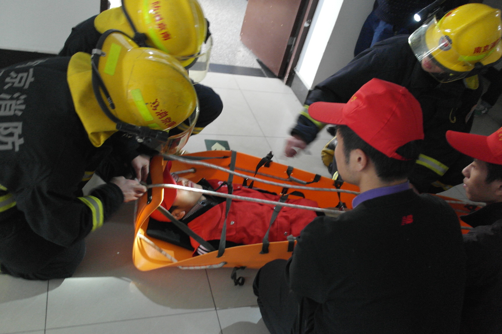 下午3:00,所有参与演习的员工以及工作人员在各自所属的位置上待命,随着闪着警灯的消防车从玉兰路驶向19舍,演习拉开了序幕。“火情出现!”19舍8楼的窗户冒出了红色烟雾,一名女同学在冒出烟雾的窗口捂住口鼻呼救挣扎着。这时,火情侦察员拨打了“119”火警电话,并拉响了警报,随后学校保卫处与校医院的工作人员赶到现场。紧接着,消防官兵从消防车工具箱内取出担架,带领负责救援的同学,换上隔热服,冲进19舍,进行灭火搜救。几分钟后,楼门口就有大批员工经楼梯跑出宿舍楼,用毛巾捂住口鼻,成功疏散。随后,两名身穿隔热服的消防队员把一位“受伤”的同学用担架抬出,并配合校医院的医护人员进行“紧急治疗”。在撤离结束、伤员清点之后,演习圆满结束。