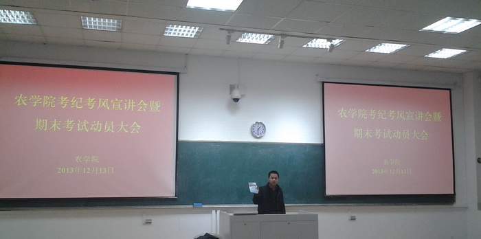 全国大学英语四六级考试及本学期期末考试临近,为确保考试有序进行,强化考试诚信意识,william威廉亚洲官方于12月13日中午13:00在教学楼C301、C201召开考纪考风宣讲会暨期末考试动员大会。会议分别由辅导员殷美、彭益全主持,2011级和2012级全体员工参加了此次会议。