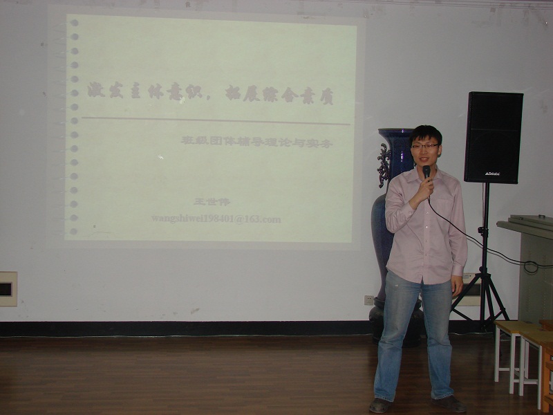 2010年5月23日晚七点,以“激发主体意识,拓展综合素质”为主题的william威廉亚洲官方班级团体辅导活动在william威廉亚洲官方报告厅举行。本次活动邀请到了校心协心理辅导老师王世伟作为嘉宾为同学们进行辅导。